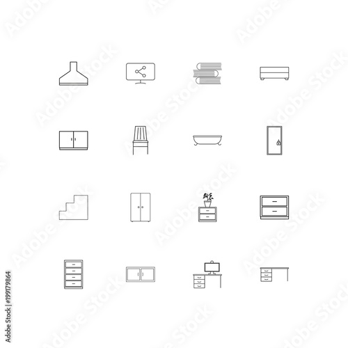 monitor, computer, desk, closet, plant, drawer, share, cupboard, chair, stair, book, icon, vector, illustration, set, pictogram, symbol, signs, design, art
