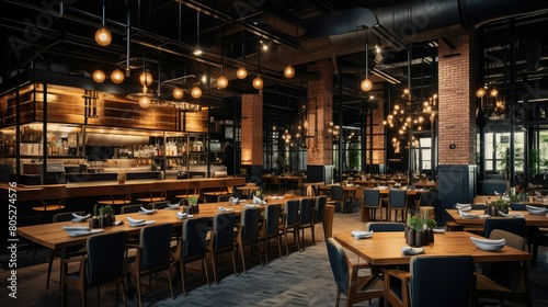 fusion, blurred, modern, eatery, interior, illustration, industrial, contemporary, design, element, exposed, brick, wall, metal, accent, edgy, urban, soft, warm, lighting, cosy, atmosphere, foreground, tied-up, energetic, popular, spot, social, gathering, celebration, background