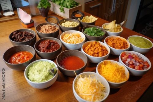 fusion taco bar, with different kinds of tacos, salsas and toppings available, created with generative ai