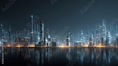 city landscape, skyline, building, future, dusk, night, architecture, modern, waterfront, water, metropolis, urban, light, structure, technology, downtown, innovation, darkness, mirror, surface, development, perspective, construction, design, tour tourism, business, corporate, financial, investment, travel, environment, scene, background, wallpaper, panorama, wide, evening, complex, nobody, abstract, geometric, connection, grid, virtual, network, system