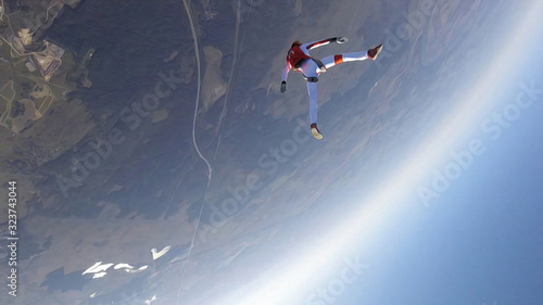 Future. Freedom as a way of life. Skydiver landed on the ground. Parachutist in professional equipment. Team of active sports.