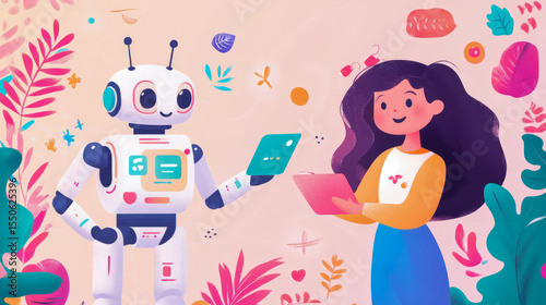 Future technology Concept: A girl interacts with robot holding a tablet on floral abstract background