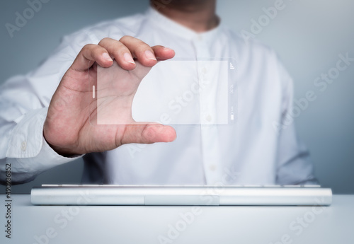 Future transparent glass phone Technology. Mock-up blank screen futuristic super slim transparent smartphone in businessman's hand while using the computer. Future technology communication equipment.