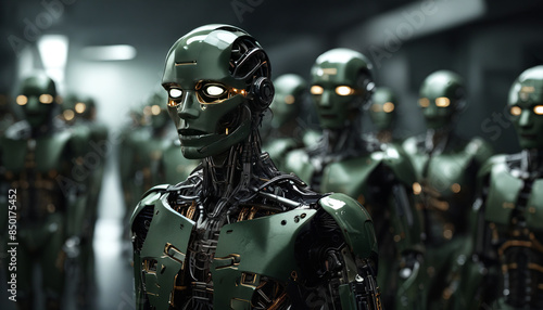 Futuristic AI Humanoid Army: High-Resolution Digital Art of Robots with Advanced Cybernetic Design for Technology and Sci-Fi Themes