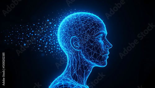 Futuristic AI-Powered Human Head with Digital Wireframe and Disintegrating Data Particles