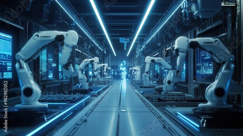 futuristic automated assembly line sleek robotic arms precisely manipulating intricate components holographic displays cool blue lighting hightech factory interior