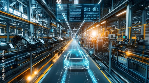 automotive, assembly, line, virtual, twin, progress, control, datum, efficiency, digital, format, copy space, factory, manufacturing, automation, technology, industry, engineering, production, workflow, process, innovation, futuristic, smart