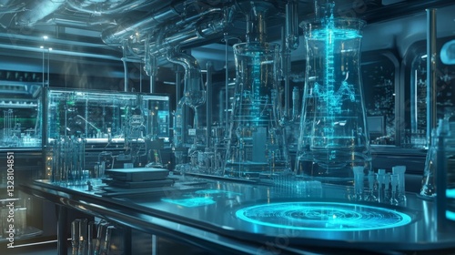 Futuristic Blue Lit Laboratory with Glowing Glass Equipment