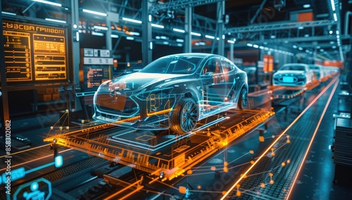 car, assembly, line, holographic, imaging, futuristic, factory, production, technology, wireframe, model, digital, automation, manufacturing, robotic, industry, modern, innovation, design, engineering, vehicle, automotive, future, advancement, progress, efficient, advanced, process, system, smart, concept, visualisation, transformation, tech, cyber, virtual, reality