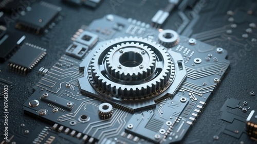 Futuristic Circuit Board with Mechanical Gear Integration, AI Technology Concept