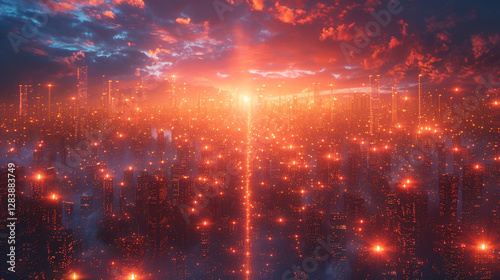 city, futuristic, sunrise, glowing, light, vibrant, colours, aerial, perspective, urban, skyline, technology, digital, network, connection, architecture, bright, energy, modern, illuminated, light, dawn, city landscape, landscape, advanced, illumination, future, orange, red, abstract, skyscraper, building, infrastructure, high technology, view, digital artwork