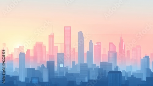 Futuristic cityscape at dusk, high-rise buildings with neon lights glowing in a cyberpunk-inspired palette