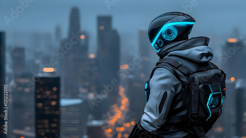 Futuristic Cityscape at Night: Person in Neon Helmet