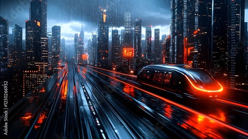 Futuristic cityscape featuring sleek monorail gliding through neon-lit skyline with reflections on wet surface during rainfall at dusk