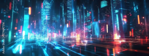 Futuristic cityscape, neon lights, reflective wet streets, cyberpunk atmosphere, urban night scene, glowing skyscrapers, pink and blue color palette, dystopian metropolis, puddles reflecting neon, hig