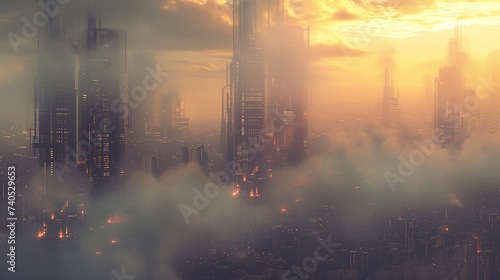 Futuristic cityscape obscured by layers of smoky, high-definition veils