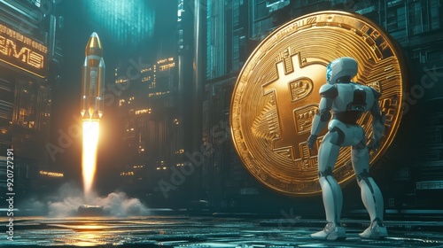 futuristic, robot, gold, rocket, technology, digital, currency, space, launch, neon, symbol, android, high technology, science fiction, innovation, finance, tech, crypto, glowing, metallic, advanced, virtual, modern, investment, dynamic, exploration, economy