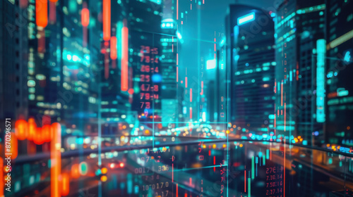 Futuristic cityscape with digital stock market data overlays and lights at night