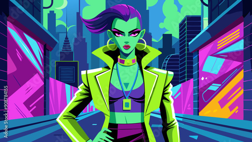 lime, green, futuristic, city landscape, female, fashionable, neon, illustration, character, style, vibrant, digital, modern, fiction, urban, trendy, nightlife, virtual, technology, cyber, attitude, cool, futurism, edgy, city, high-coloured, science fiction, science, jacket, purple, identity, metropolis, graphic, design, powerful, stylised, bold, avant-garde, chic, cybernetic, downtown, vector