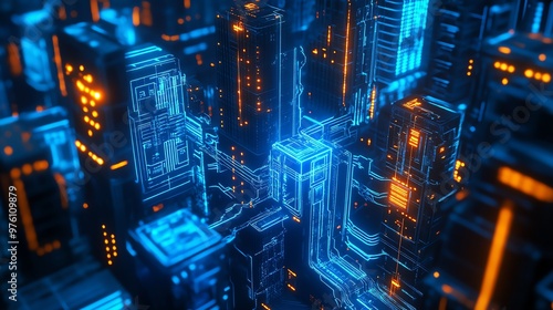 Futuristic cityscape with glowing blue and orange lights, symbolizing technology and innovation in a digital world.