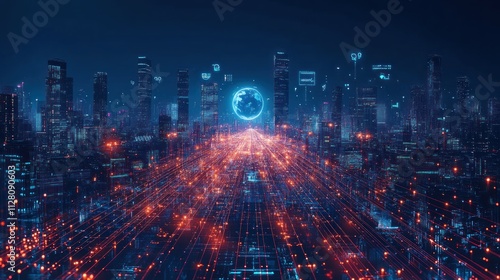 city, global, network, connection, technology, digital, futuristic, city landscape, datum, cyberspace, communication, earth, innovation, progress, future, modern, urban, infrastructure, globalisation, information, science, development, society, business, finance, economy, growth, advancement, speed, fast, efficient, seamless, intelligent, smart, powerful, dynamic, vibrant, energy, light, line, glowing, abstract, background, illustration