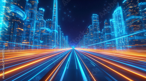 futuristic, city landscape, glowing, traffic, trail, cyber, urban, skyline, digital, night, light, metropolis, modern, technology, science fiction, future, city, architecture, motion, speed, neon, blue, skyscraper, high technology, dynamic, movement, energy, vibrant, transportation, illuminated, abstract, rush, high speed, luminescent, perspective, fast, digital artwork, virtual, innovation, network, fantasy, downtown, advanced, metropolitan, cyberspace, skyscraper, building, dramatic