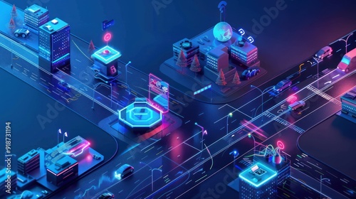futuristic, city landscape, neon, light, connected, car, network, glowing, line, three-dimensional, illustration, city, technology, digital, future, urban, street, road, traffic, smart, night, blue, purple, pink, abstract, concept, art, design, graphic, style, background, pattern, texture, space, modern, geometry, vector, rendering