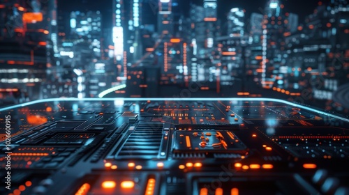 Futuristic cityscape with neon lights and high-tech circuit board