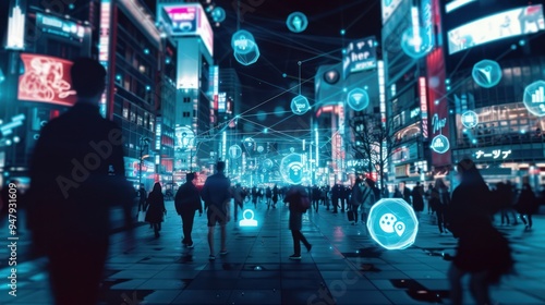 city landscape, street, people, night, urban, technology, network, digital, icon, futuristic, datum, connected, city, modern, architecture, light, building, glow, blue, neon, abstract, graphic, design, interface, art, virtual, earth, cyber, graphic, interactive, innovation, communication, environment