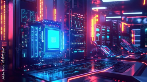 Futuristic Computer Circuit Board With Glowing Neon Lights And Digital Effects. High Tech Background. Motherboard And Server Hardware. Data Processing And Network Infrastructure. Cyber Technology