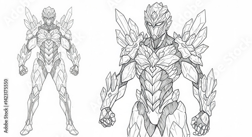 Futuristic crystal armored warrior character for a detailed coloring page.
