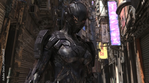 female, bounty, hunter, cybernetic, eye, combat, armoring, urban, alley, neon, light, futuristic, warrior, fierce, digital, art, render, shadowy, dramatic, lighting, technology, strong, fiction, character, design, protagonist, edgy, reality, detailed, city