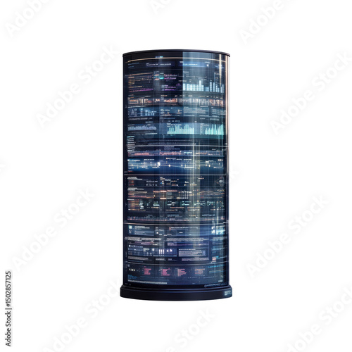Futuristic Cylindrical Data Display with Holographic Interface and Complex Data Streams