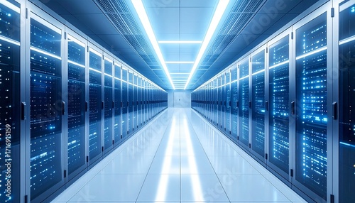 Futuristic data center hallway with rows of server racks illuminated by bright blue and white neon lights.