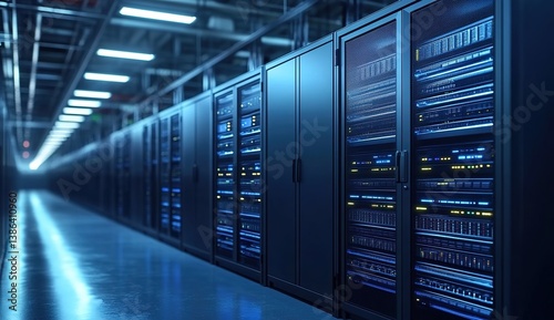 Futuristic data center hallway with server racks and colorful LED lights, blue and purple glow, high-tech atmosphere, ambient lighting, modern infrastructure