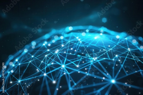 futuristic data transfer visualization with glowing blue network connections forming a globe shape abstract background suggests global connectivity and information flow