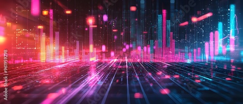 Futuristic data visualization featuring a dynamic and vibrant neon lit cityscape with abstract tech elements modern and innovative graphic representation