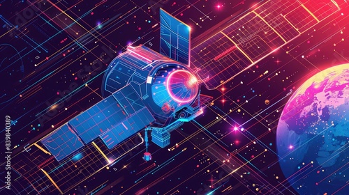 Futuristic digital art of a satellite orbiting Earth with neon colors and abstract patterns in space.