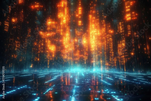Futuristic digital cityscape with glowing orange high-rise structures reflected on blue grid-like ground, evoking a high-tech advanced technology atmosphere