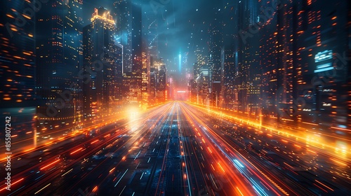 Futuristic digital grid overlaying a dark cyberpunk cityscape. The neon lights and holographic displays create a high-tech and dystopian atmosphere