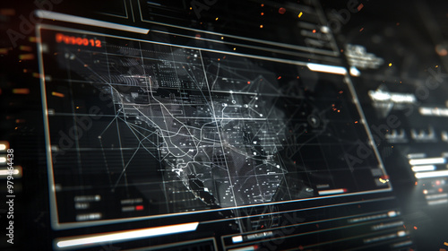 Futuristic digital interface with real-time crime prediction data, map highlighting high-risk areas and crime trends, clean dark background emphasizing advanced technology.