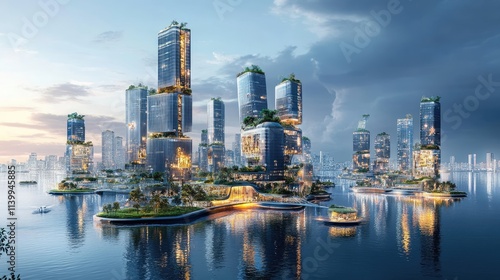 city, futuristic, skyscraper, building, architecture, modern, eco, friendly, green, sustainable, urban, design, waterfront, water, ocean, sea, lake, river, island, landscape, city landscape, tower, structure, highrise, metropolis, development, technology, innovation, progress, environment, nature, plant, tree, evening, twilight, sky, cloud, calm, tranquil, boat, light, illumination