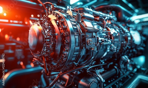 engine, futuristic, industrial, setting, closeup, view, lighting, red, blue, technology, mechanical, machine, power, engineering, metal, steel, innovation, design, manufacturing, energy, automotive, aviation, turbine, motor, component, system, complex, detail, gear, cog, pipe, wire, connection, dark, background, abstract, performance, industry, modern, advanced, science, equipment, vehicle, transport, mechanism
