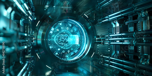 Futuristic Engine Room - Advanced Technology, High-Tech Machinery - Sci-Fi Design, Glowing blue futuristic spaceship engine room