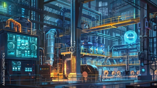 factory, industrial, futuristic, technology, machine, machinery, robot, automation, science, fiction, digital, electronic, steel, metal, engine, control, panel, monitor, screen, wire, pipe, cable, structure, construction, design, blue, dark, glowing, light, shadow, interior, graphic, art, illustration, artwork, fantasy, concept, scene