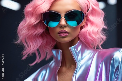 woman, caucasian, neon, futuristic, fashion, portrait, pink, confident, cyberspace, digital, future, advertisement, urban, model, lifestyle, posing, smart, light, person, girl, female, robot, beauty, ai, colourful, style, background, trendy, neon light, clothing, coat, jacket, pretty, hair, coiffure, colours, stylish, face, 20s, science fiction, promotion, people, cyber, shopaholic, high-coloured