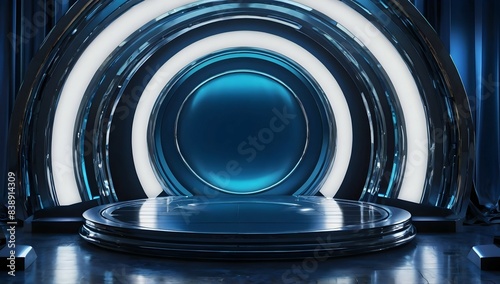 futuristic fashion show stage background blue color and chrome with circle in the middle