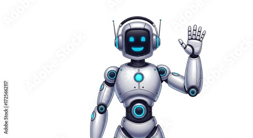 Futuristic friendly humanoid robot waving hello with a digital smile, isolated on a white background