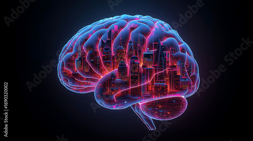 Futuristic glowing brain with integrated digital cityscape, symbolizing artificial intelligence, neural networks, and advanced technological innovation