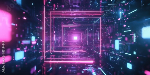 Futuristic glowing neon rectangular frame with glitch effects, surrounded by a deep black background